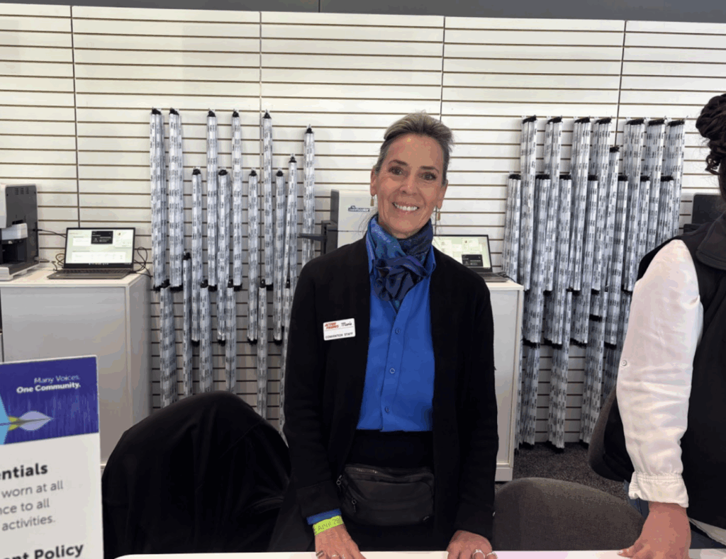Maria Cabrales stands behind the press badge credential booth at RSAC in San Francisco’s Moscone Center South building on April 28. By Adam Manno