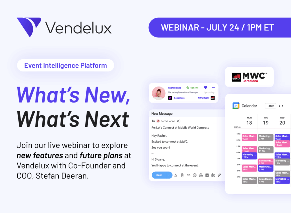Join Vendelux Co-founder Stefan Deeran on July 24th at 1:00 PM ET for a live walkthrough of our latest product updates – including Salesforce and HubSpot integrations to help you tie events directly to pipeline, smarter persona targeting, event ROI projections and more!